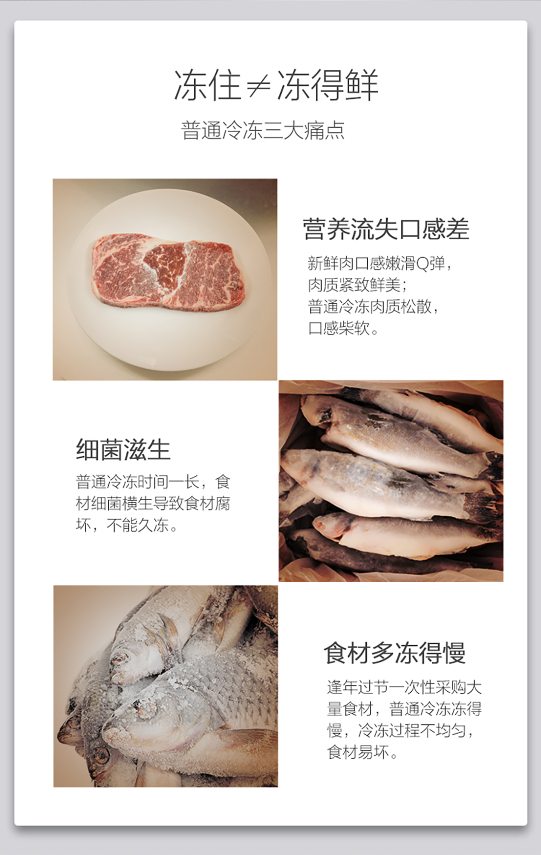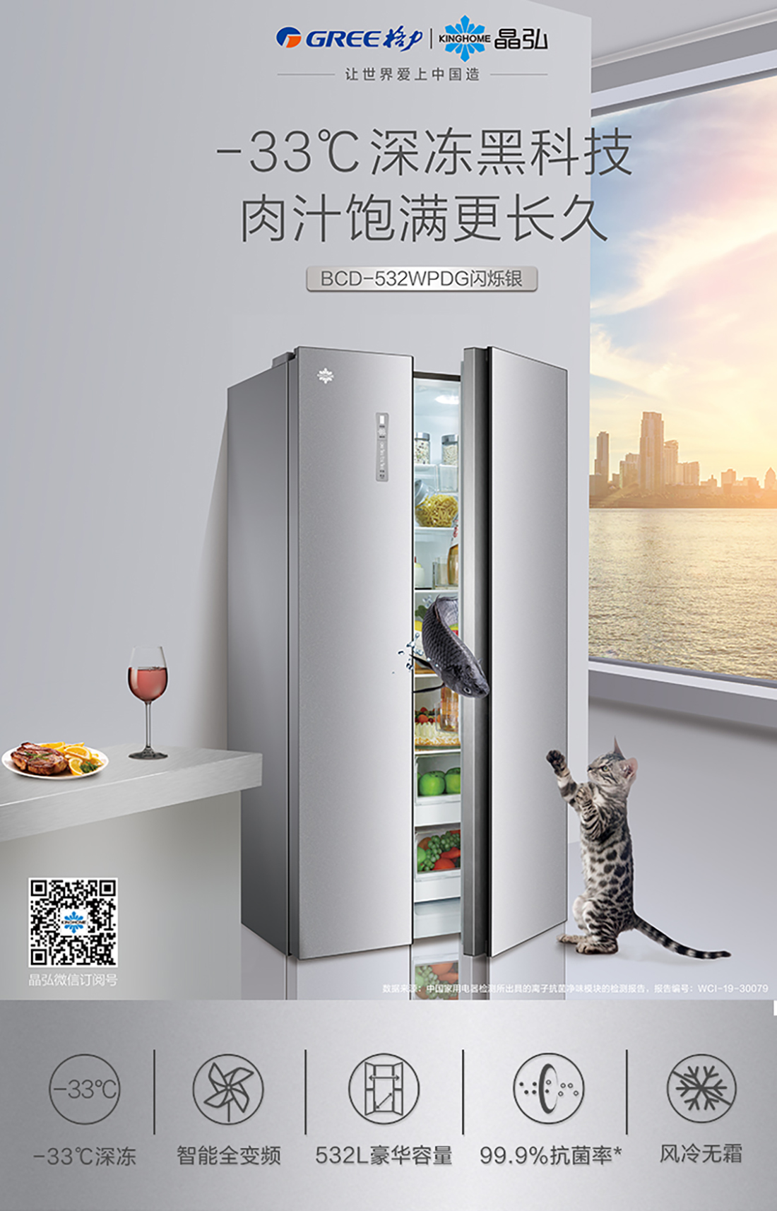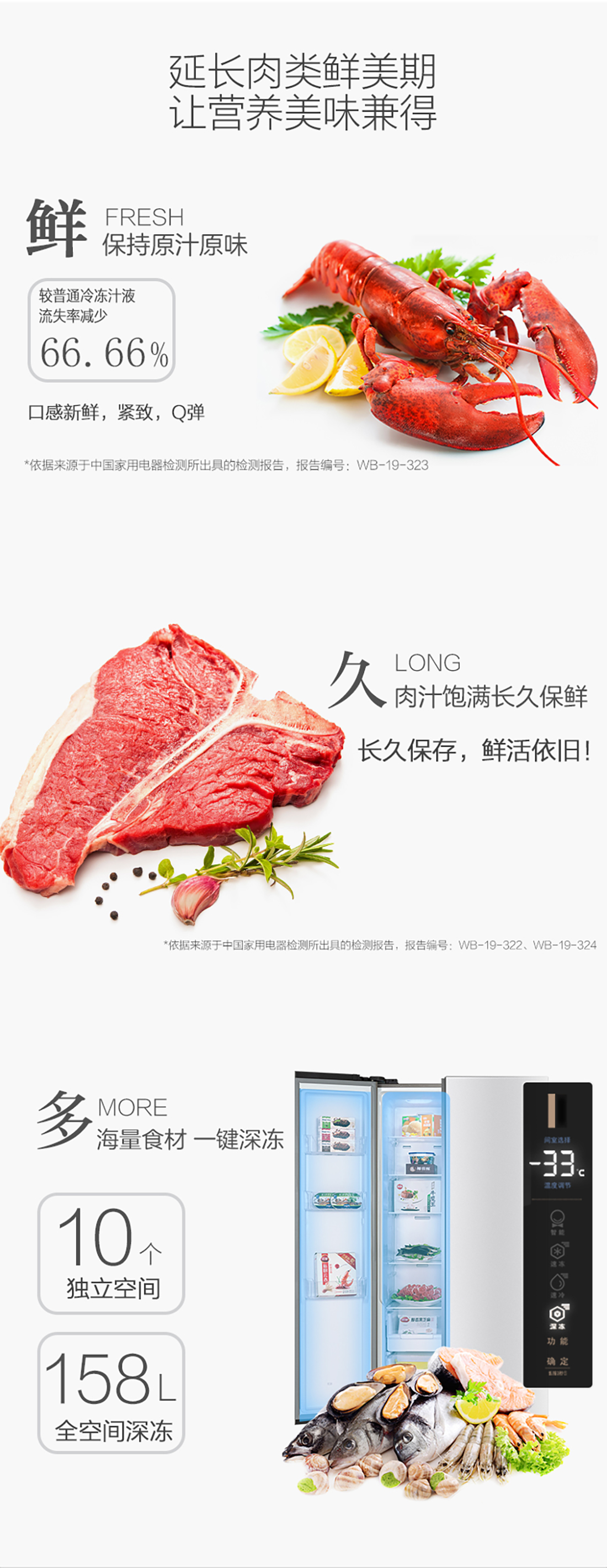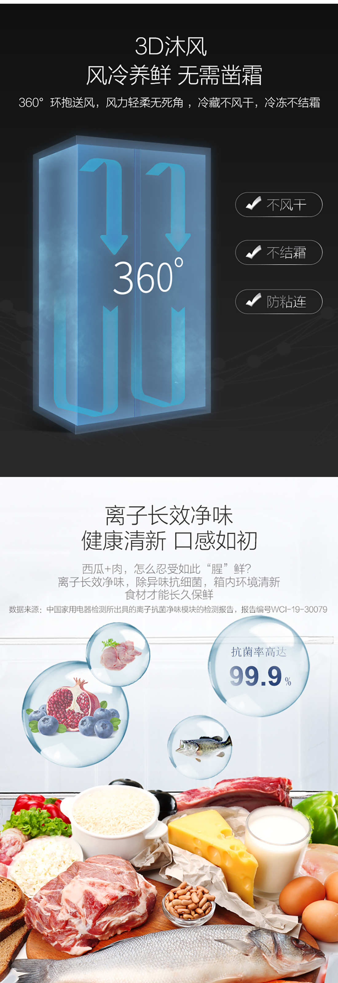 搭載-33℃深凍鎖鮮科技,肉汁飽滿更長(zhǎng)久。采用離子長(zhǎng)效抗菌凈味,抗菌率高達(dá)99.9%。3D沐風(fēng),風(fēng)冷養(yǎng)鮮,無(wú)需鑿霜。
